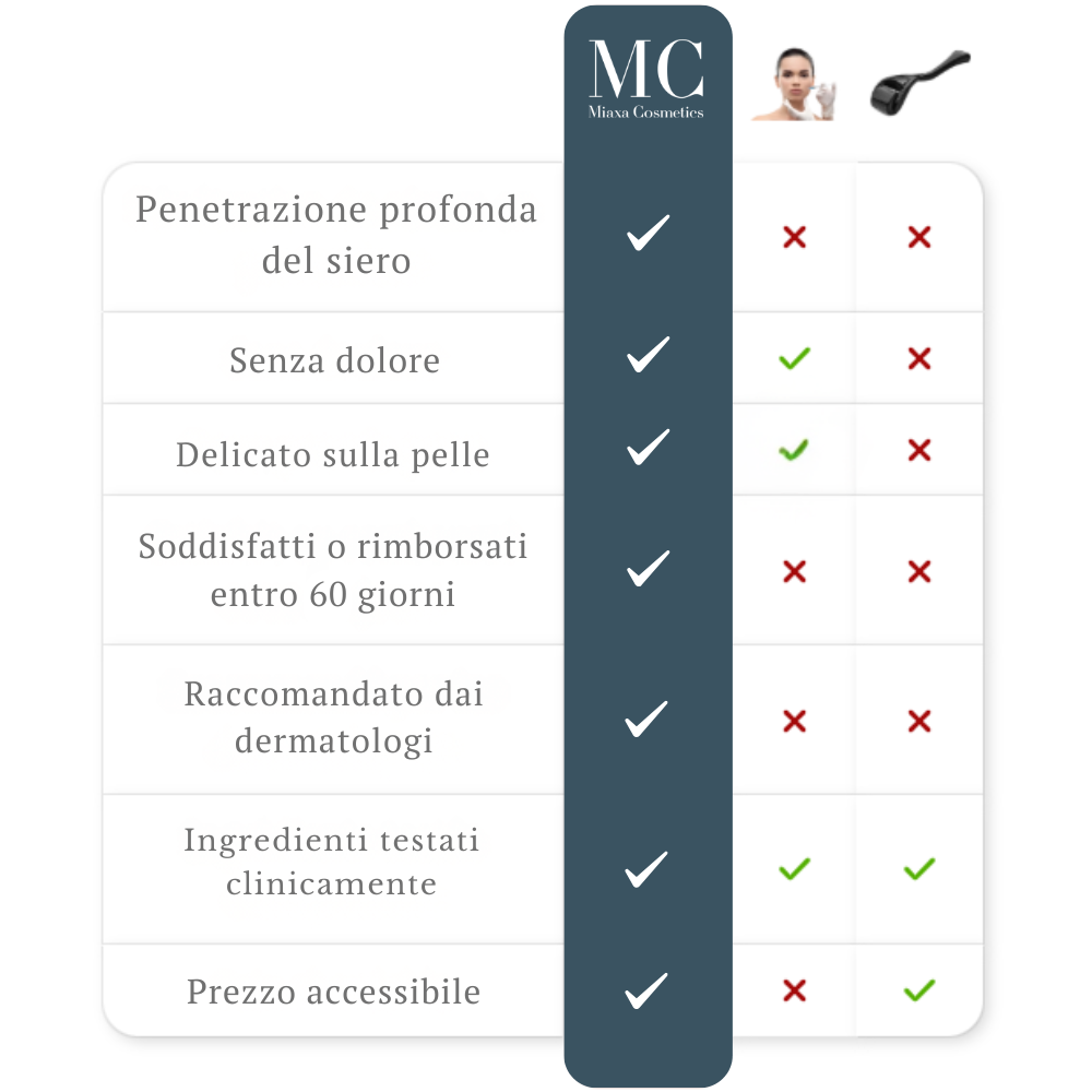 Sistema di Micro-Infusione Miaxa™ a confronto con i trattamenti clinici tradizionali e con i dispositivi domestici concorrenti.